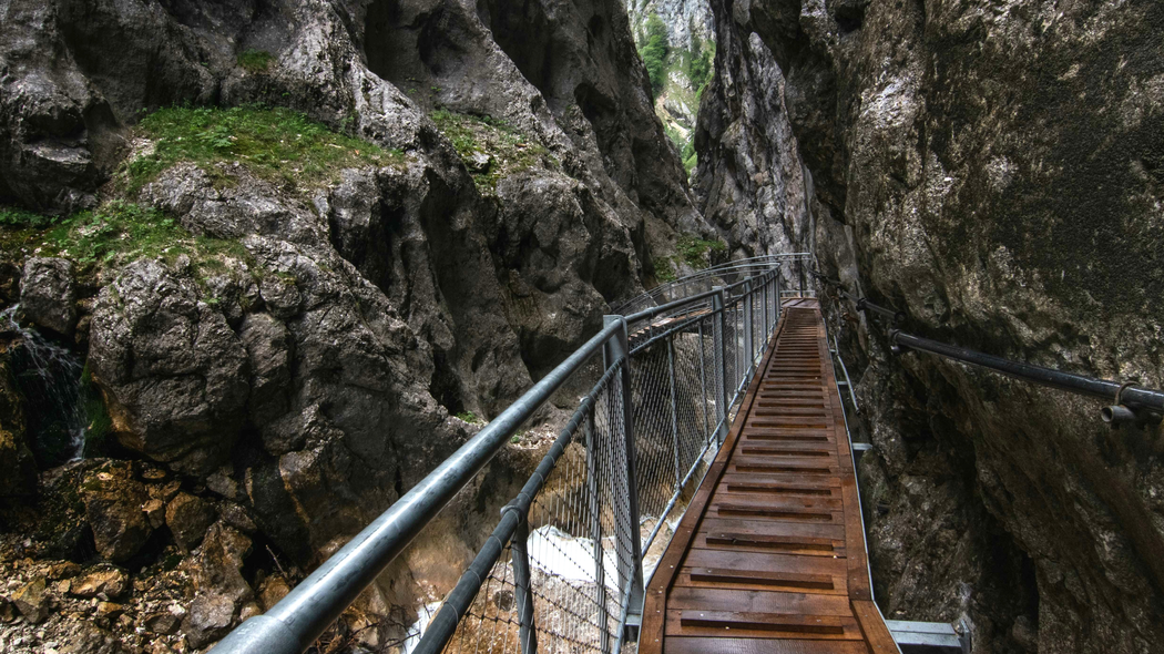 Bevor wir uns den beiden nasskalten Highlights im Detail widmen, gilt es noch eine Frage zu klären: Was ist eine Klamm überhaupt? Es handelt sich um eine schmale Schlucht im Gebirge, durch die ein Fluss oder Wildbach fließt. Oft hat sich das Wasser über Jahrtausende immer tiefer und tiefer in den blanken Fels gegraben. Künstlich angelegte Holzstege oder mit der Spitzhacke in den Stein geschlagene oder gesprengte Wege führen entlang des reißenden Gewässers. Oft kreuzen kleine Brücken die zum Teil mehr als 100 Meter tiefen Schluchten. Vor allem nach Regentagen, wenn das Wasser in Wasserfällen und Rinnsalen an den steilen Wänden seinen Weg in die Tiefen sucht, bieten Klammen ein eindrucksvolles Naturspektakel.
