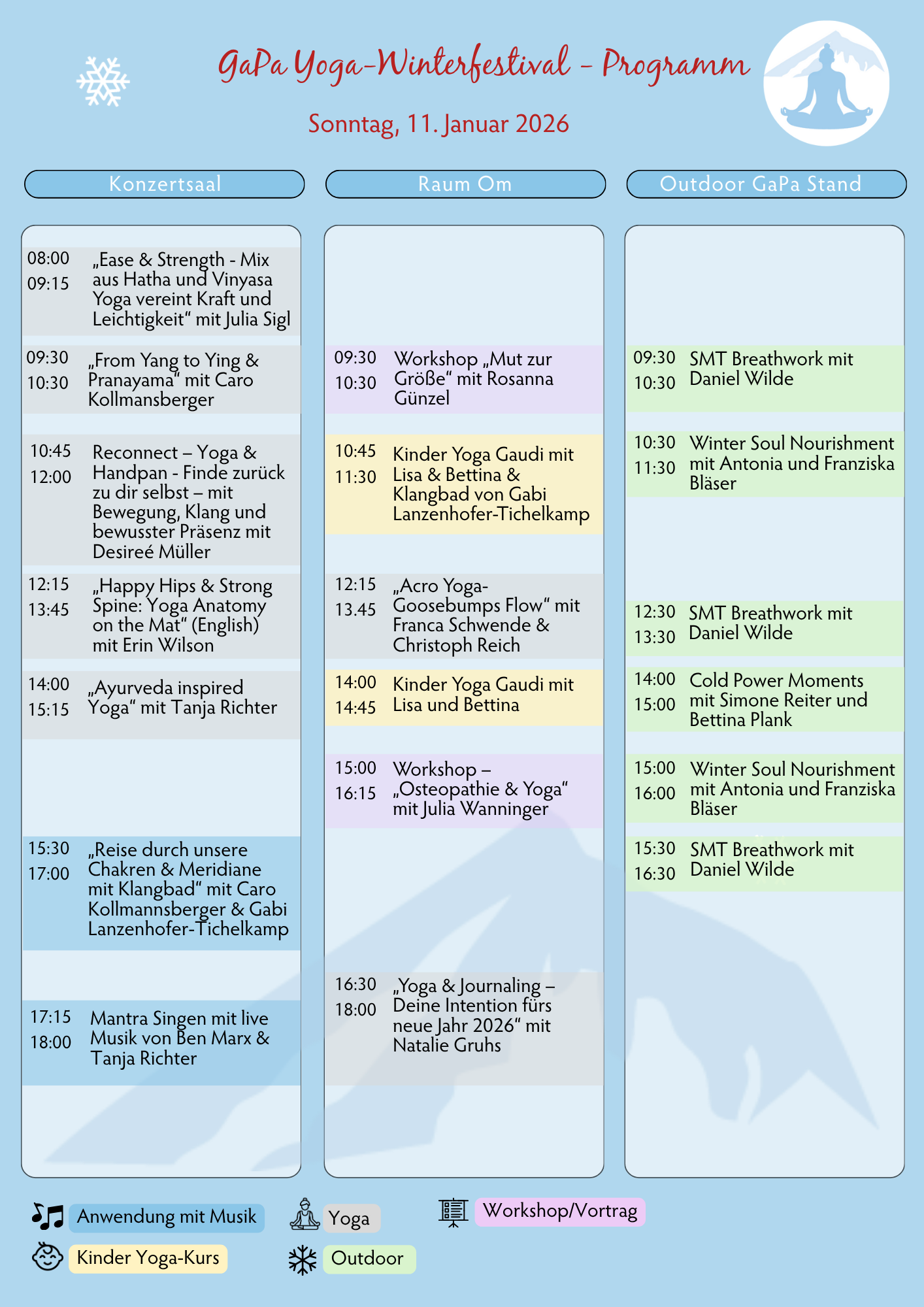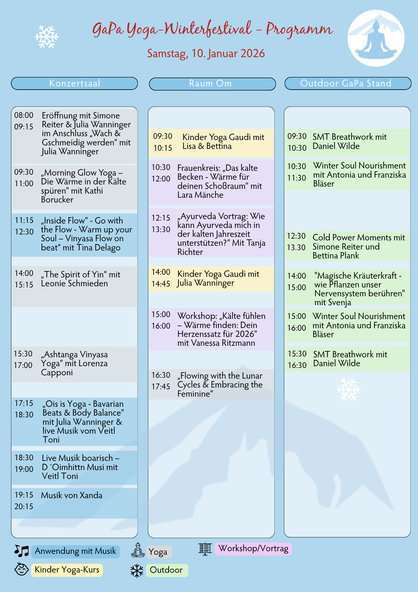 Erlebe ein vielfältiges Festivalprogramm, das Körper und Seele in Einklang bringt. Freu dich auf inspirierende Yoga-Sessions, kraftvolle Breathwork-Einheiten, Workshops für jedes Level sowie eigene Angebote für Kinder. Abgerundet wird das Programm durch bayerische Lebensfreude, Musik und tolle Aussteller – mitten in der einzigartigen Winterkulisse von Garmisch-Partenkirchen.